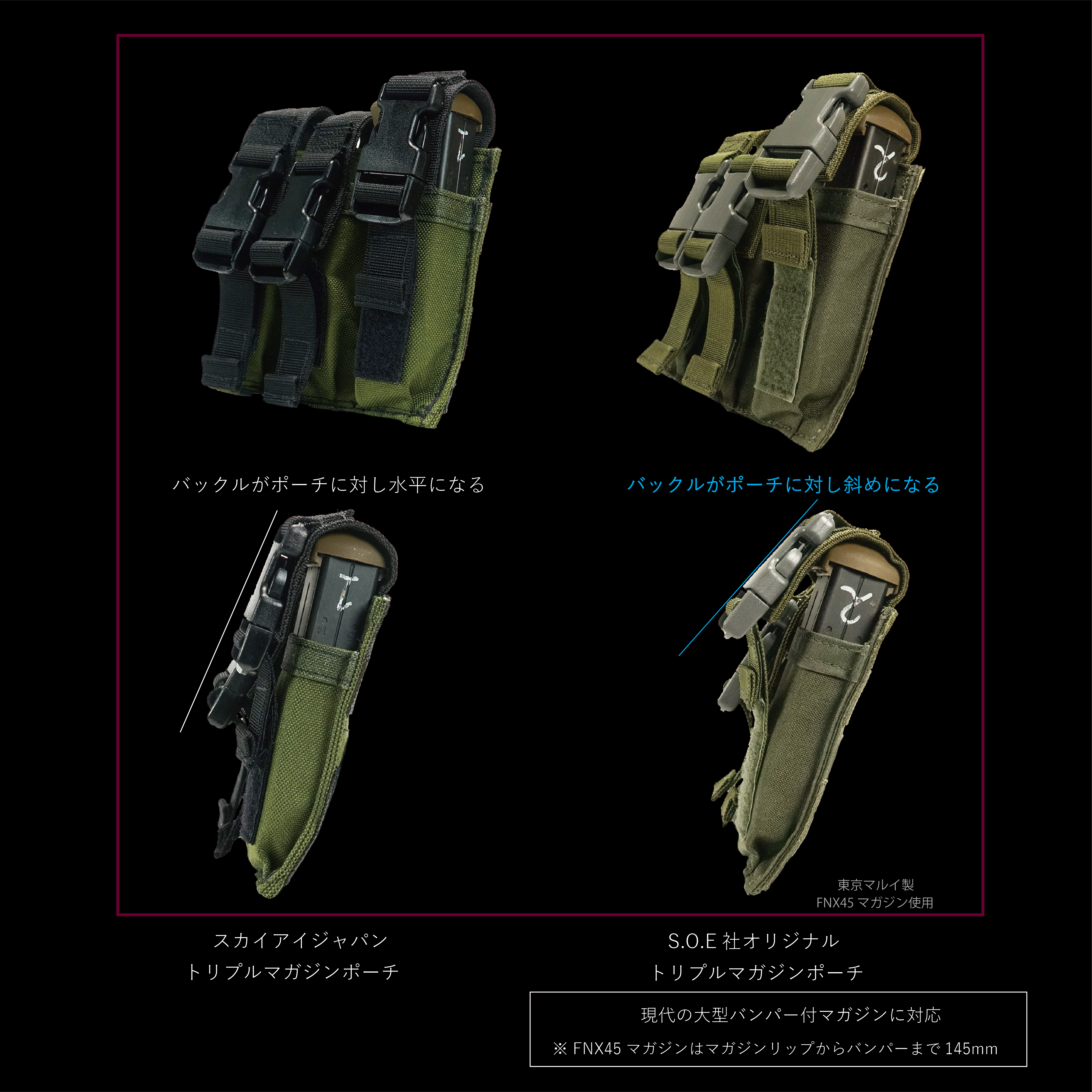 オリジナルのS.O.E社のマガジンポーチは現代のタクティカル系マガジンには必須のバンパーを取りつけたマガジン(特にエアソフトガン)を収納すると、フラップの長さが足りないためまっすぐ閉じずバックルが斜めになってしまいました。