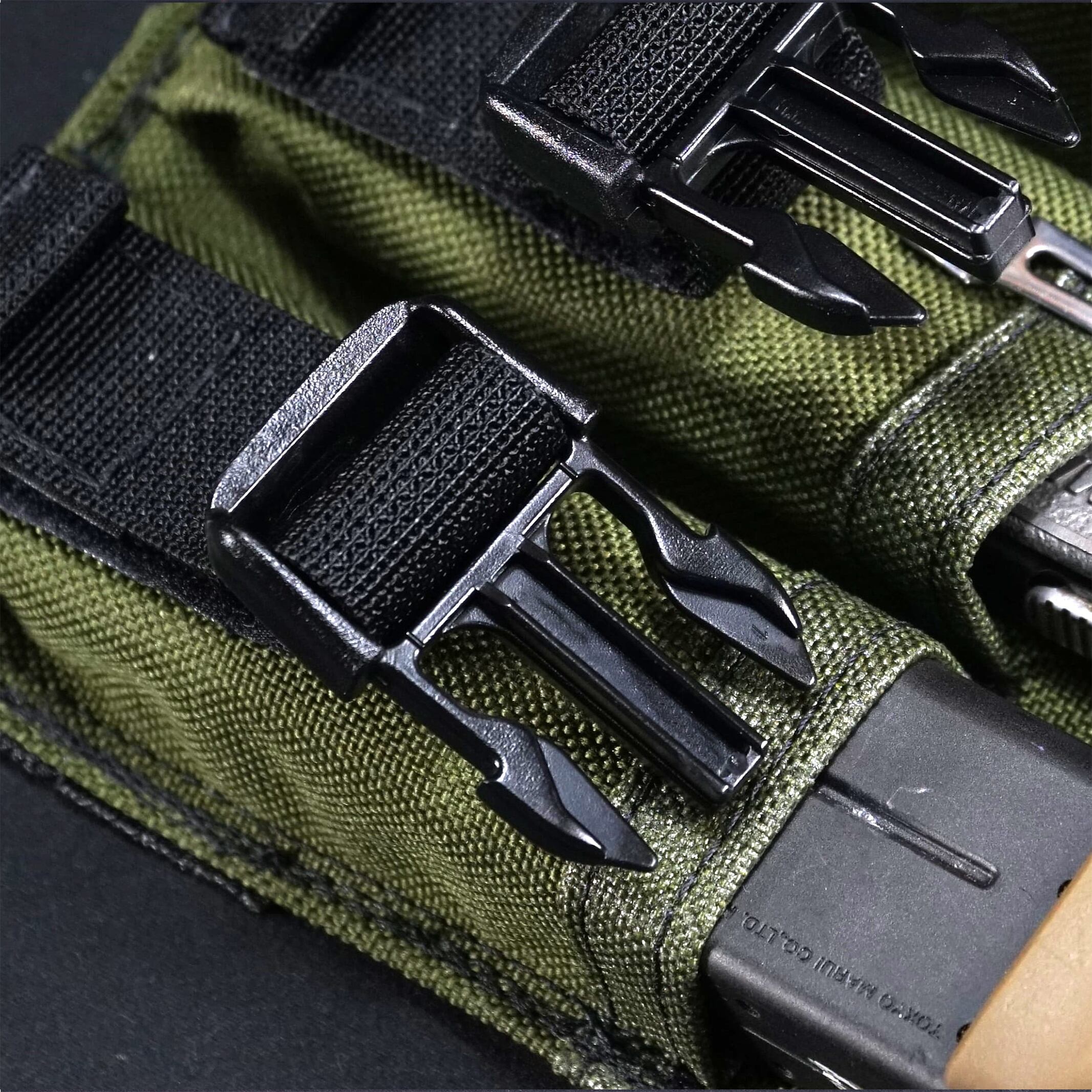 オリジナルのマガジンポーチの背面はベルクロ&アリスクリップなどによる固定方式で、ベルトに取り付けることを前提としてましたが、現代のタクティカルギアには合わないためMOLLE方式を採用。ベルトだけでなくベストにも固定可能です。