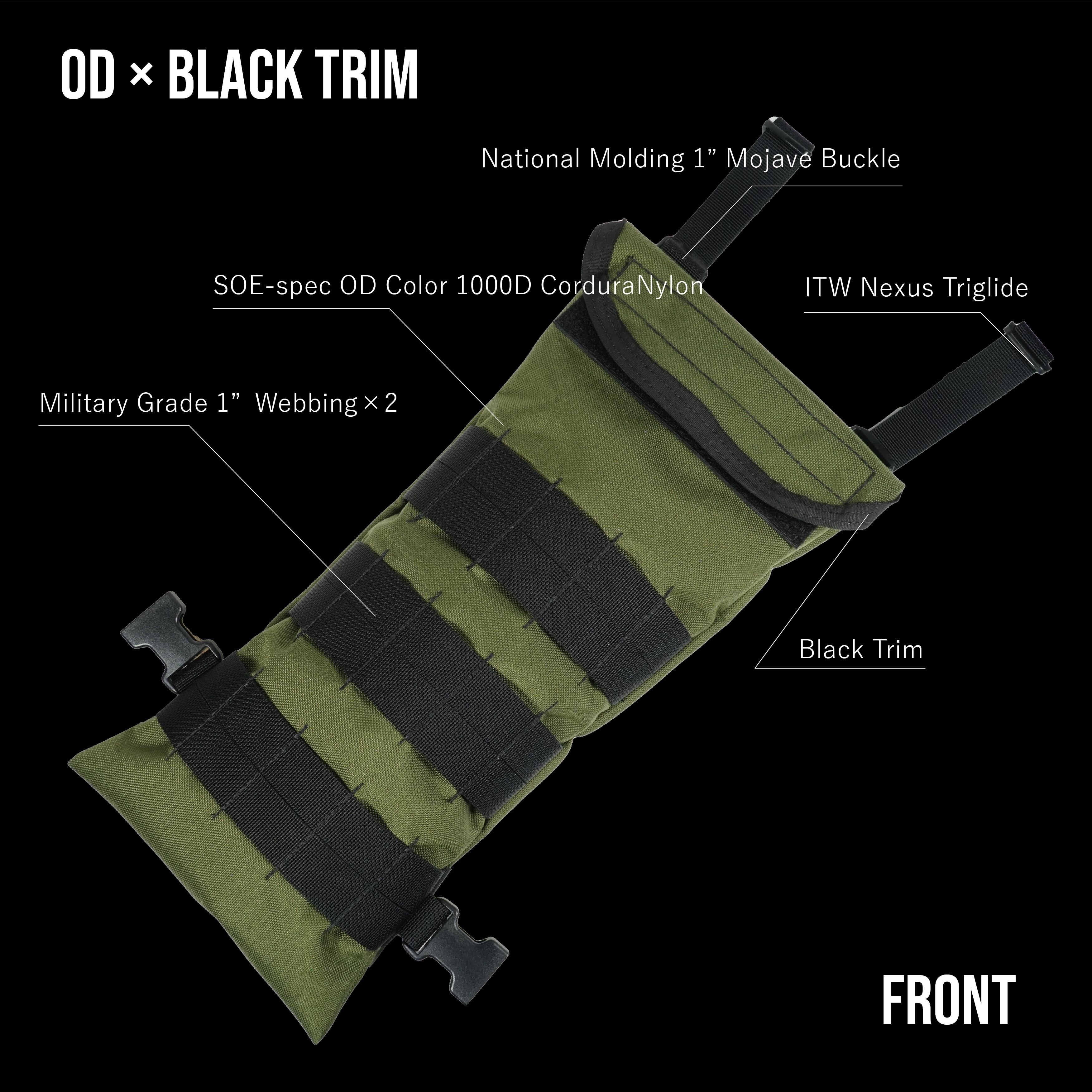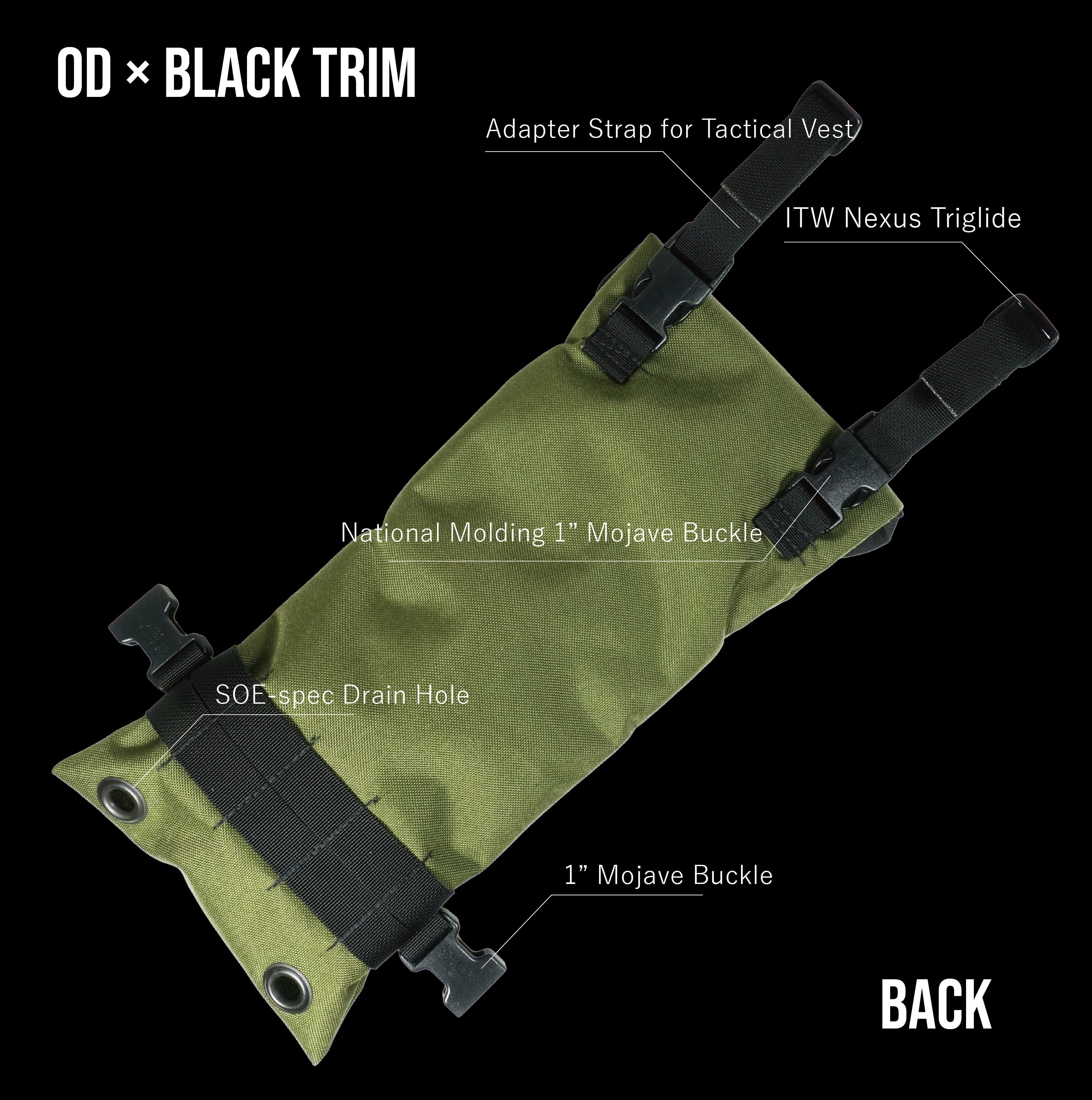 SOEや同様の規格を持つタクティカルベストに取り付けるために必要なアダプターストラップが付属。National Molding のMojaveバックルだけでなく、ストラップの長さを調整するパーツはITW Nexus Triglideを使用し、リザーバーが満された状態(2kg以上)でも破損したり、ストラップが意図せず緩んでしまうこと防ぎます。