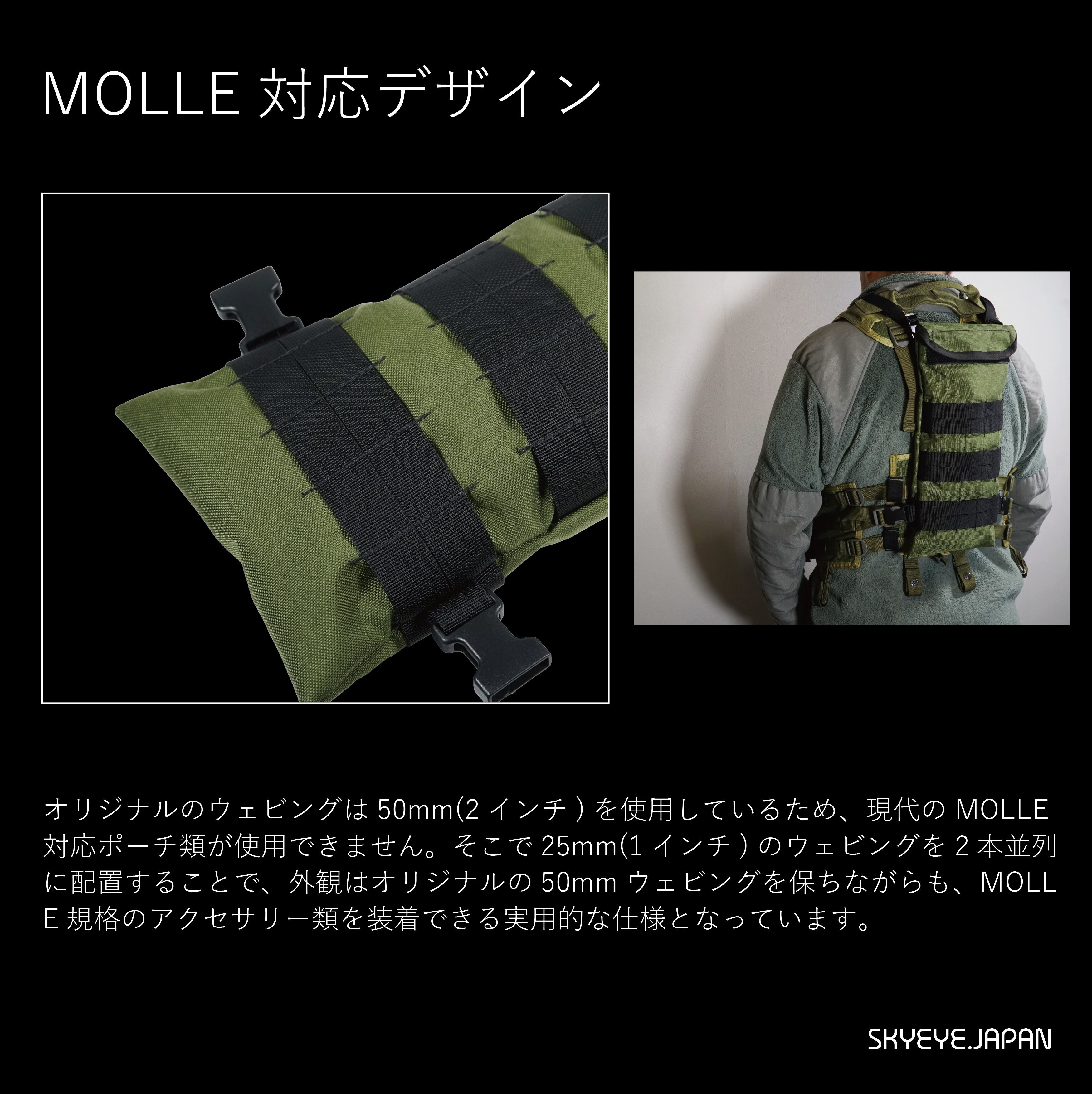 SOEオリジナルのハイドレーションキャリアの正面と背面には50mmのウェビングが配置されていましたが、現代のタクティカルギアには合わないため25mmウェビングを2列配置し、見た目は50mm,しかしMolle対応の見た目と実用性を両立したデザインとなっています。